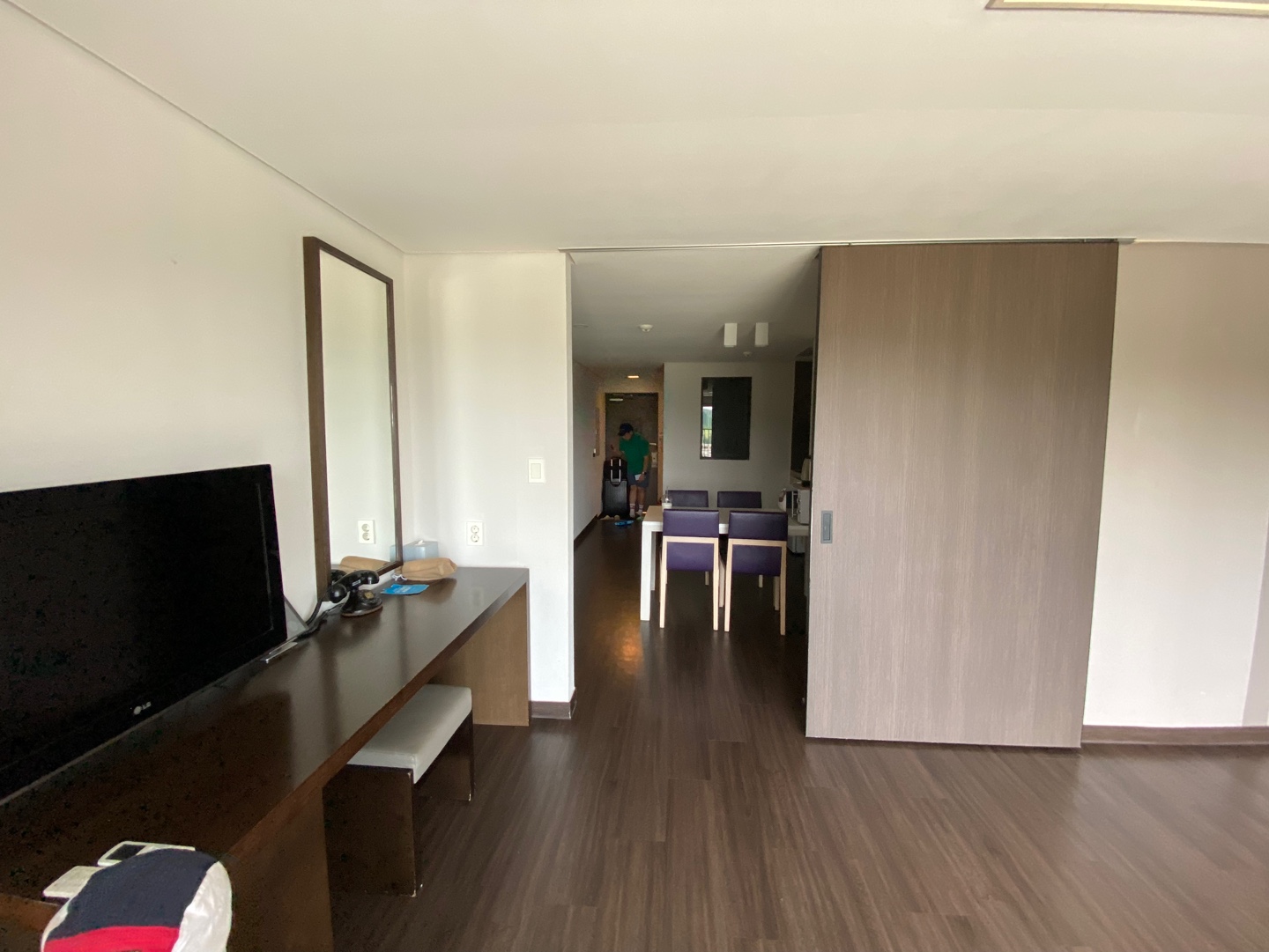 룸에 들어서자 입구 옆으로 작은 방이 있고, 앞으로 거실과 주방, 큰 방이 있다.