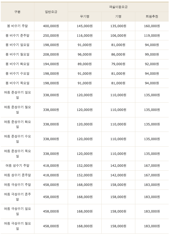 봄, 여름 비수기~성수기 때, 일반 요금은 19만~46만 원대로 되어 있고, 한화 리조트 회원권을 소지한 사람이라면 금액이 엄청 싸진다.