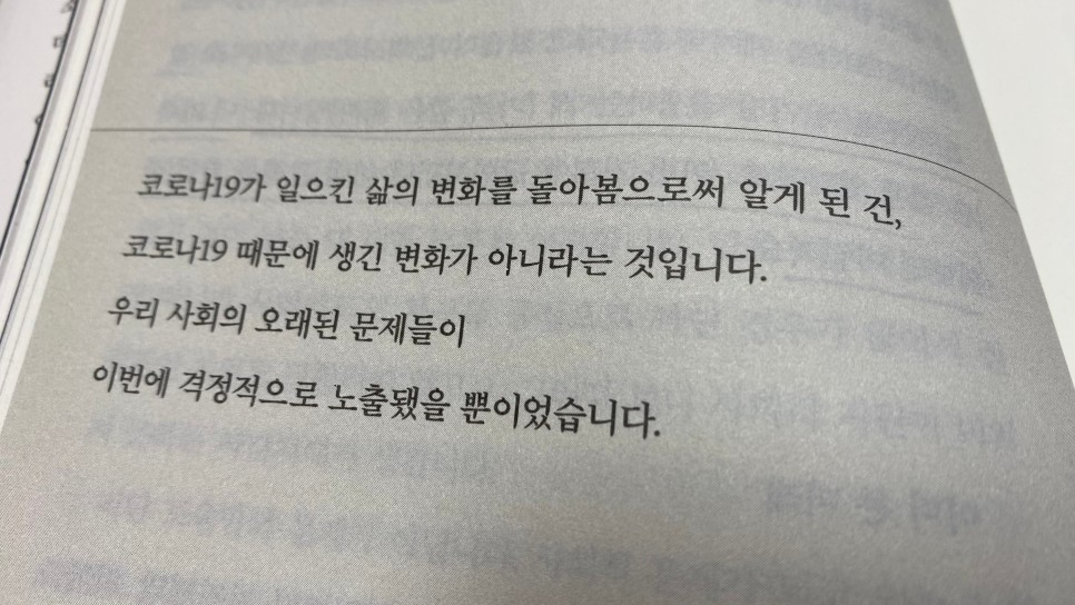 코로나19 발생 이후 삶에 변화가 일어난 것은 코로나19 때문이 아니라 필연적으로 일어났어야 할 일 들이 코로나19를 계기로 격정적으로 노출되었다는 이야기를 한다.