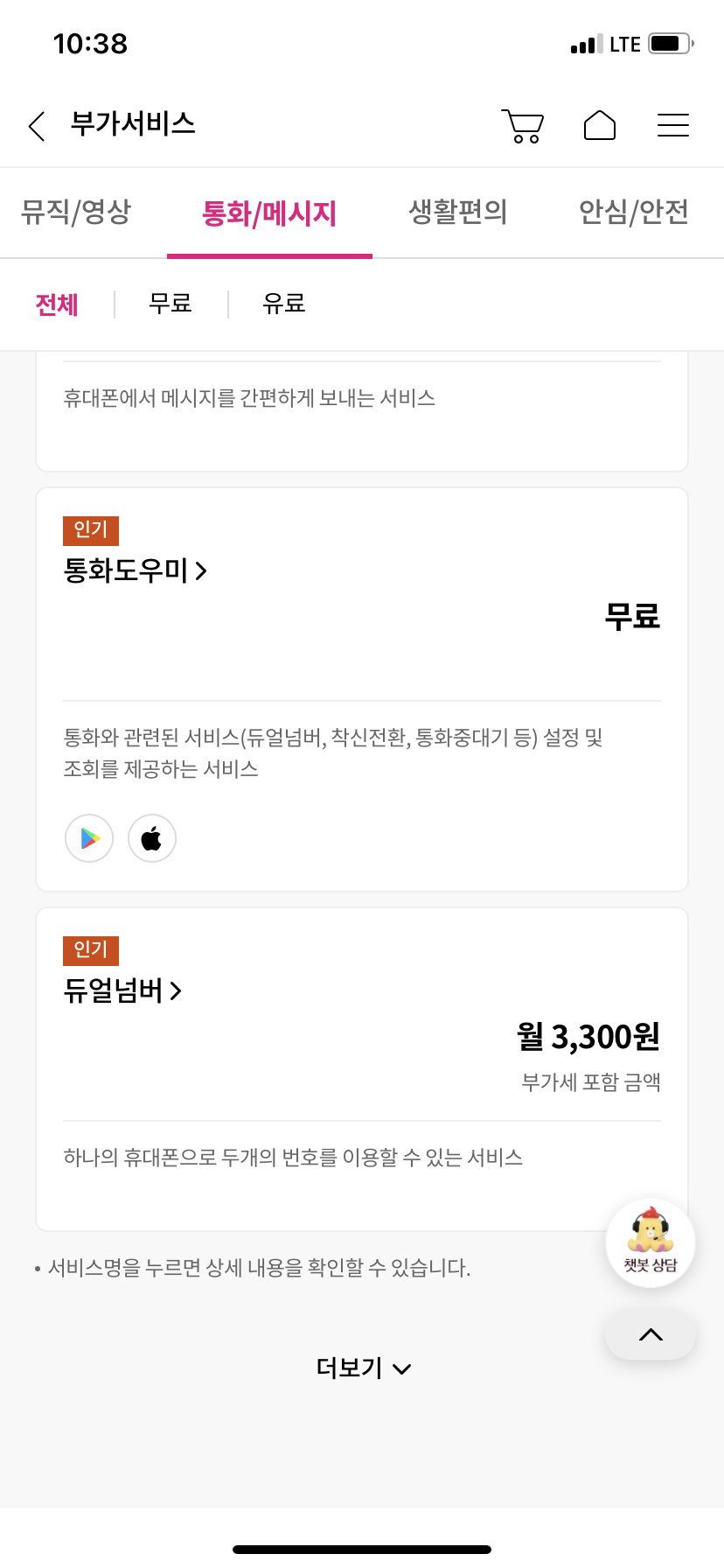 4. 아래의 화면에서 부가서비스 상세를 확인할 수 있다.