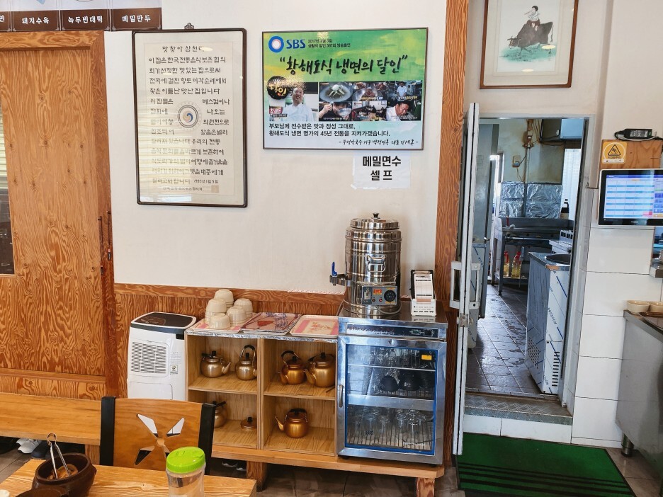 홀에 들어서면, 오래된 인테리어의 느낌이다. 정면에 부엌과 메밀면수 셀프대가 있다. 메밀면수는 따뜻하고 고소한 보리차 느낌이다. 들어서자마자 보이는 액자들에서 맛에 대한 자부심을 느낄 수 있었다.