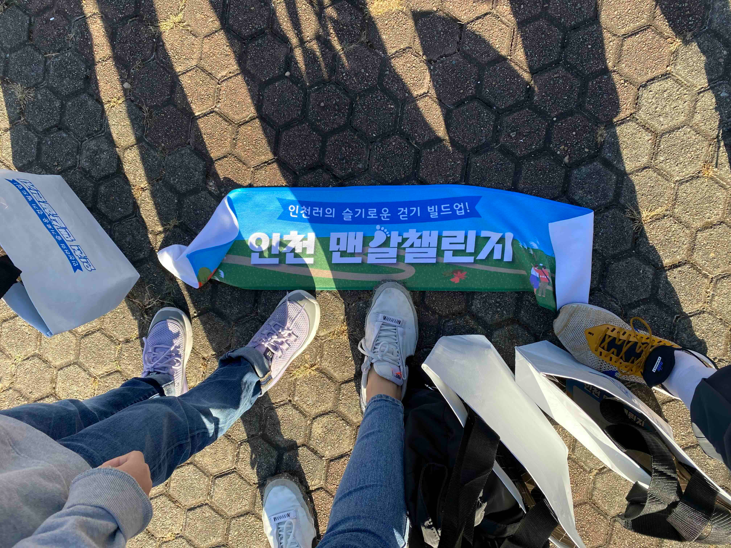도착하여 참가 인원 접수를 마치고, 가방에 행사 슬로건이 적힌 수건과 생수 한 통, 배 번호를 받았다. 수건에는 "인천러의 슬기로운 걷기 빌드업! 인천 맨발 챌린지"라는 문구가 적혀 있다.