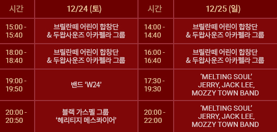 - 이벤트 : 산타클로스 & 루돌프와 함께 하는 포토타임, 다채로운 공연, 벌룬 드롭 세리머니, 카운트다운 세리머니 등