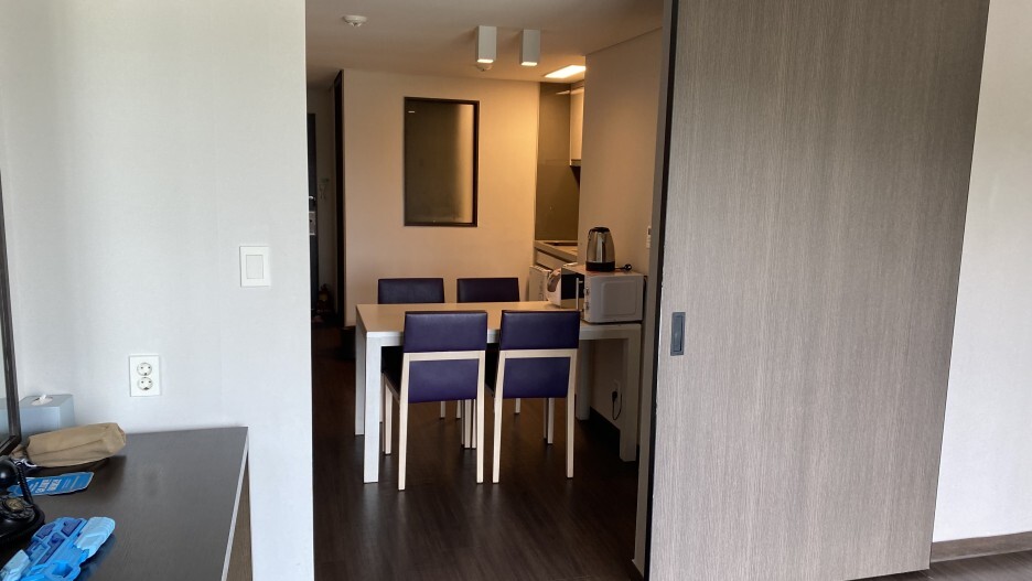 룸에 들어서자 입구 옆으로 작은 방이 있고, 앞으로 거실과 주방, 큰 방이 있다.