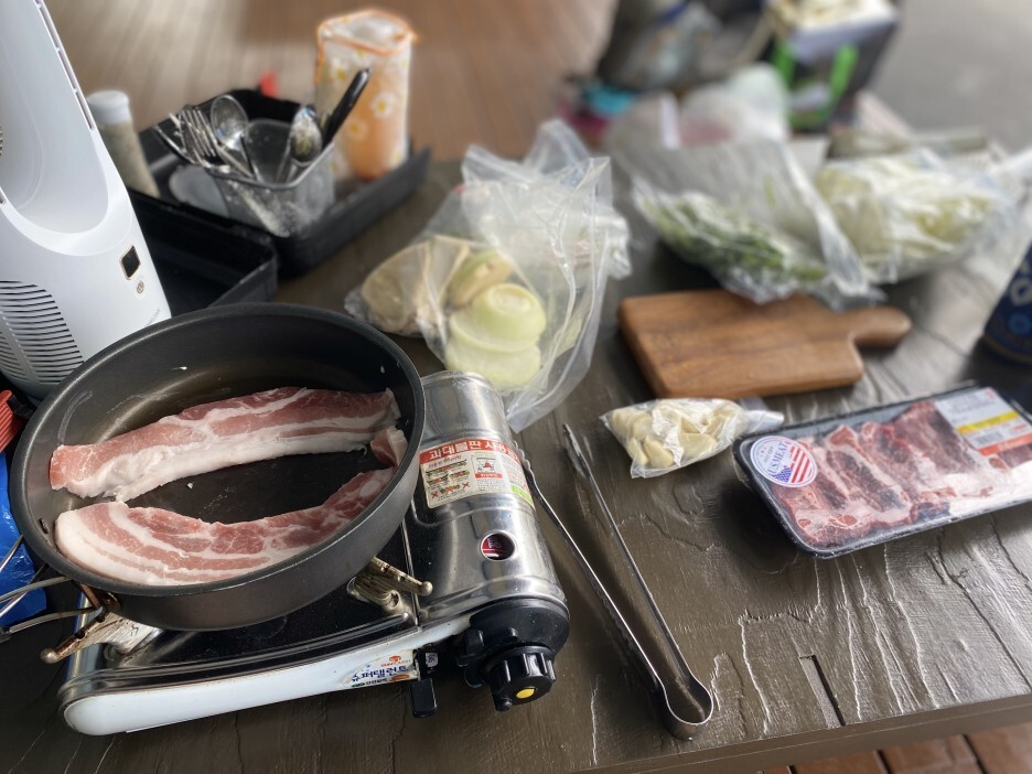 풀장에서 한참 놀고 고기를 굽고 컵라면을 끓여 먹었다.