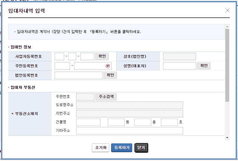 현재 나는 혼자 하는 사업자이기 때문에, 나머지 필수 입력항목이 아닌 것들은 비워둔다. 임대차내역은 타인소유로 선택한 뒤, 임대차 내역에 임대인 정보와 임대차 부동산 소재지 등을 임대차계약시 사용한 계약서와 전대동의서에 내용을 토대로 입력한다.