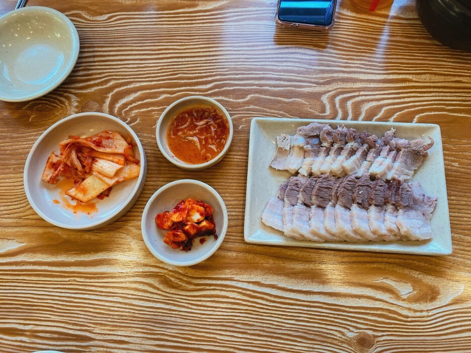 주문한 메뉴 중 수육이 먼저 나왔다. 새우젓과 익은 김치 그리고 양념마늘이 나왔는데 정갈하다. 김치와 양념된 마늘은 여러 번 리필했다(맛이 좋다 수육과 궁합이 미친 것 같다). 수육도 당연히 한 번 더 리필.